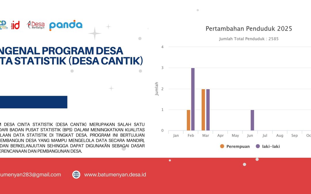 Program Desa Cinta Statistik (Desa Cantik) merupakan salah satu inovasi dari Badan Pusat Statistik (BPS) dalam meningkatkan kualitas pengelolaan data statistik di tingkat desa. Program ini bertujuan untuk membangun desa yang mampu mengelola data secara mandiri, akurat, dan berkelanjutan sehingga dapat digunakan sebagai dasar dalam perencanaan dan pembangunan desa.